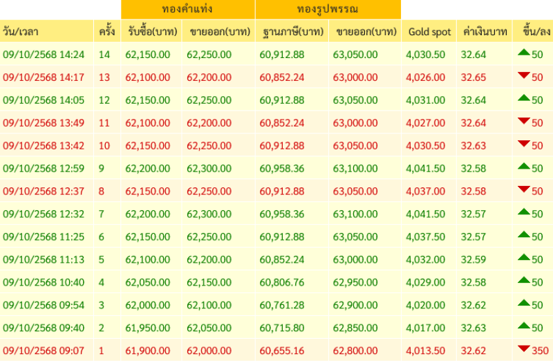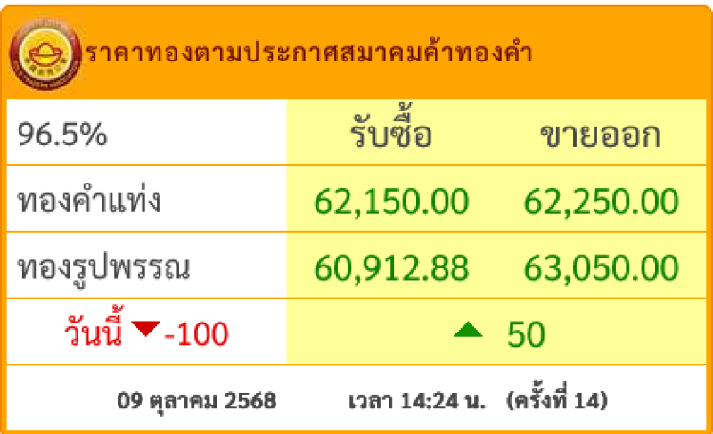 สำหรับราคาทองคำเปิดตลาดประจำวันที่ 9 ตุลาคม 2568 เปิดตลาดปรับลง 350 บาท ในครั้งที่1 ต่อมามีการปรับขึ้น-ลง รวมแล้ว 14 ครั้ง โดยทองรูปพรรณขาย ตามข้อมูลจากเว็บไซต์ของ สมาคมค้าทองคำ เมื่อเวลา เวลา 14:24 น.