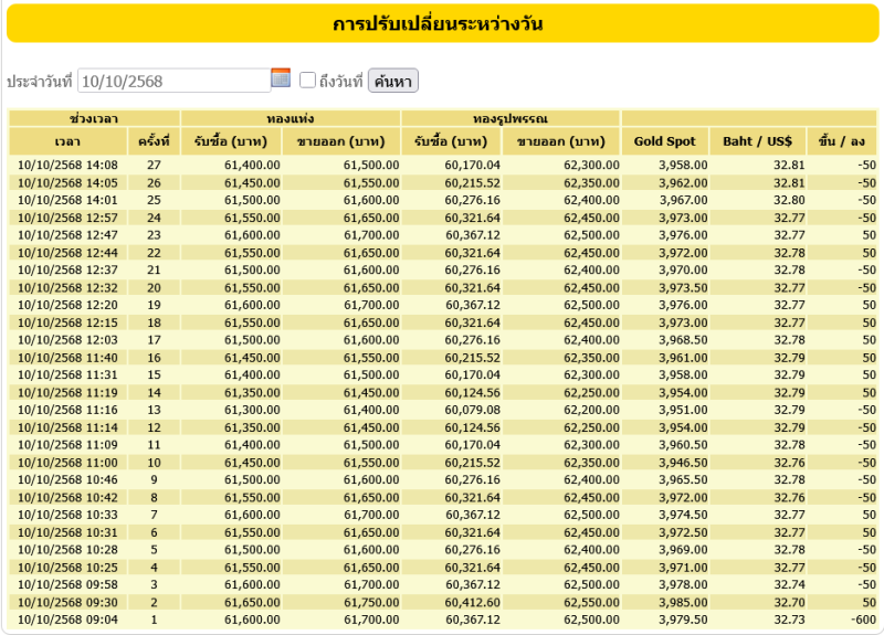 สำหรับราคาทองคำเปิดตลาดประจำวันที่ 10 ตุลาคม 2568 เปิดตลาดปรับลง 600 บาท ในครั้งที่1 ต่อมามีการปรับขึ้น-ลง รวมแล้ว 27 ครั้ง โดยทองรูปพรรณขายออกบาทละ 62,300 ตามข้อมูลจากเว็บไซต์ของ สมาคมค้าทองคำ เมื่อเวลา 14.08 น.