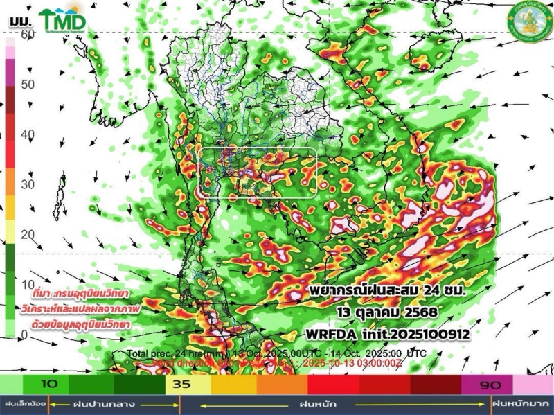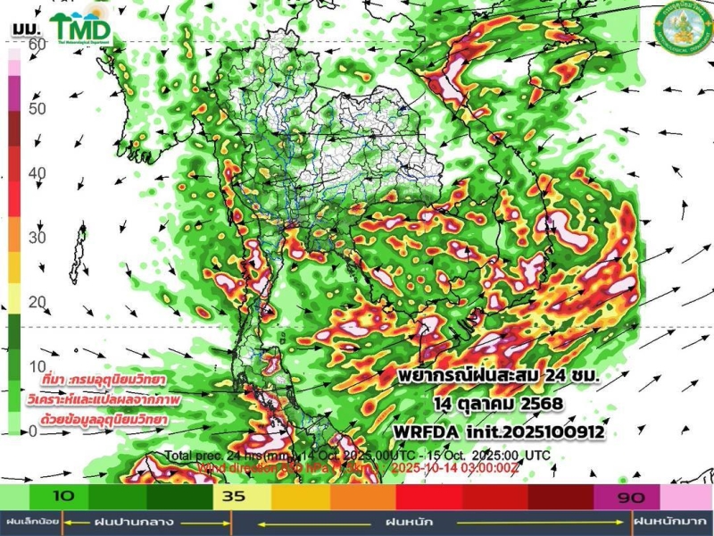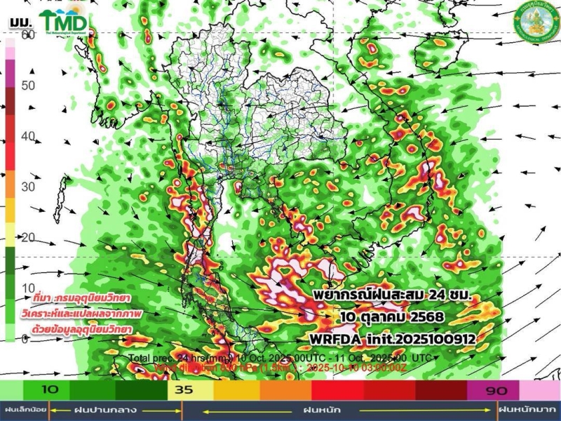 วันที่ 10 ต.ค. 68 กรมอุตุนิยมวิทยา อัพเดทผลการพยากรณ์ฝนสะสมรายวัน (ทุกๆ 24 ชม. (นับตั้งแต่ 07.00น. ถึง 07.00น.วันรุ่งขึ้น) และลมที่ระดับ 850hPa (1.5 กม.)10 วันล่วงหน้า ระหว่าง 10-19 ต.ค.68 จากแบบจำลองของกรมอุตุนิยมวิทยา (TMD-WRFDA) เฉดสีแสดงถึงปริมาณฝน (มม.) สีเขียวฝนเล็กน้อย สีแดงหมายถึงฝนหนัก (มากว่า 35.1มม.)