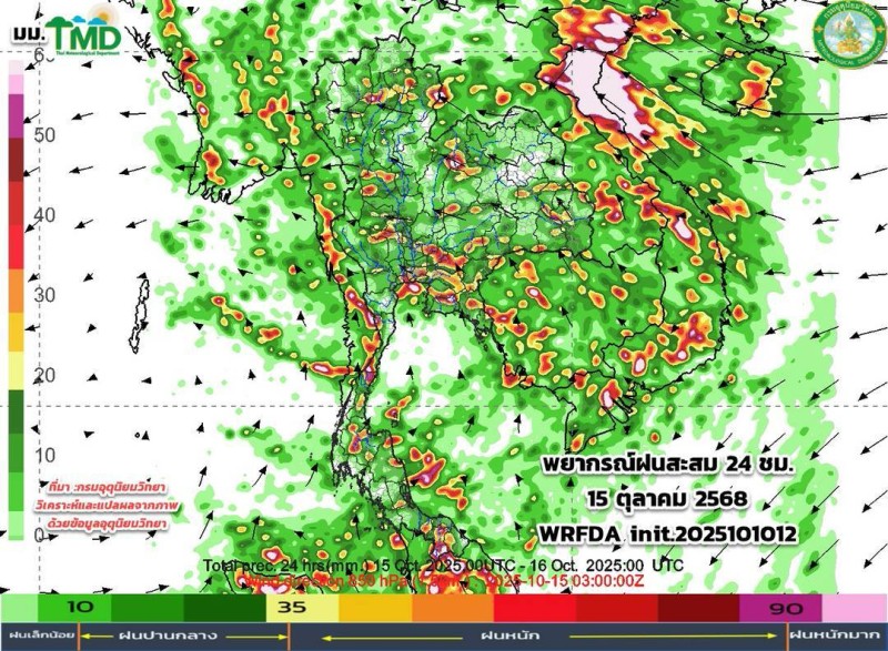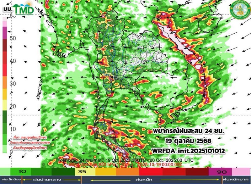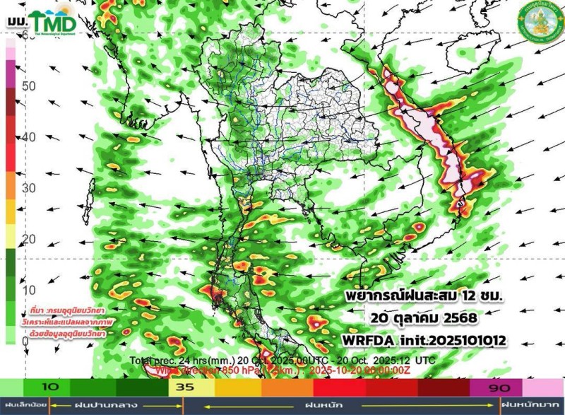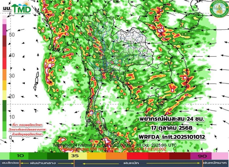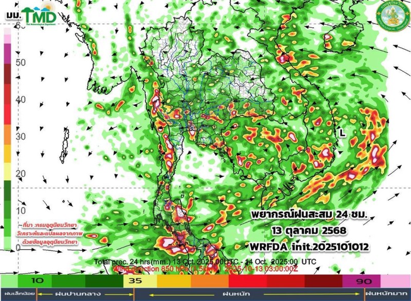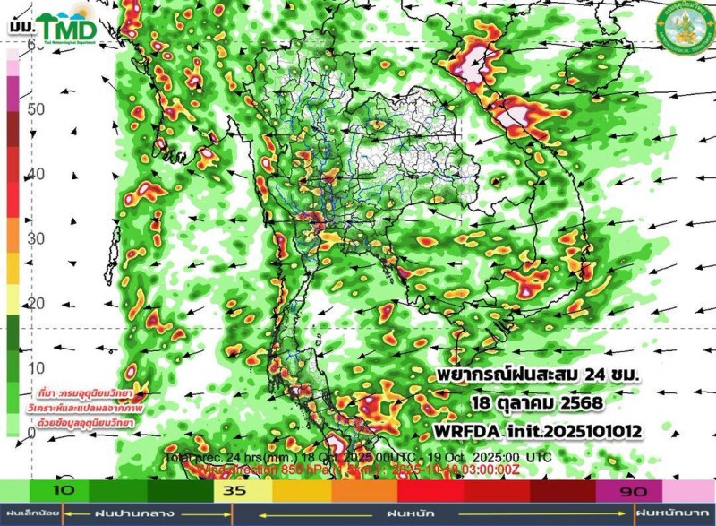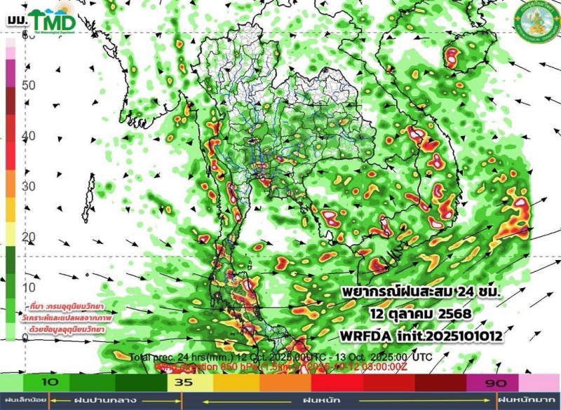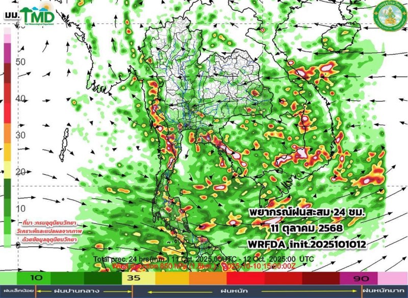 เมื่อวันที่ 11 ตุลาคม 2568 ศูนย์ประชาสัมพันธ์กรมอุตุนิยมวิทยา ประกาศผลการพยากรณ์ฝนสะสมรายวัน ผ่านเพจเฟซบุ๊ก กรมอุตุนิยมวิยา โดยระบุว่า อัปเดตผลการพยากรณ์ฝนสะสมรายวัน (ทุก ๆ 24 ชม. นับตั้งแต่ 07.00 น. ถึง 07.00 น.วันรุ่งขึ้น และลมที่ระดับ 850hPa 1.5 กม.10 วันล่วงหน้า ระหว่าง 11 – 20 ต.ค. 68 จากแบบจำลองของกรมอุตุนิยมวิทยา (TMD-WRFDA) เฉดสีแสดงถึงปริมาณฝน (มม.) สีเขียวฝนเล็กน้อย สีแดงหมายถึงฝนหนัก (มากว่า 35.1มม.)
