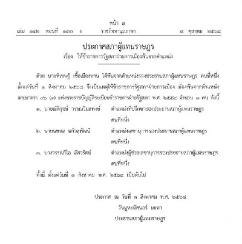ด้วย นายพิเชษฐ์ เชื้อเมืองพาน ได้พ้นจากตำแหน่งรองประธานสภาผู้แทนราษฎร คนที่หนึ่ง ตั้งแต่วันที่ 1 สิงหาคม 2568 จึงเป็นเหตุให้ข้าราชการรัฐสภาฝ่ายการเมือง ต้องพ้นจากตำแหน่ง ตามมาตรา 96 (3) แห่งพระราชบัญญัติระเบียบข้าราชการฝ่ายรัฐสภา พ.ศ. 2554 จำนวน 3 คน ดังนี้