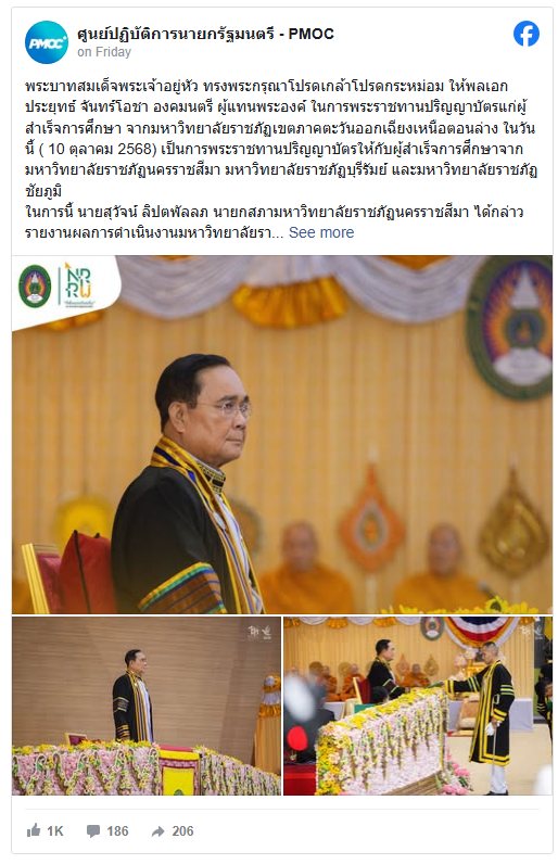 เมื่อวันที่ 10 ตุลาคม พระบาทสมเด็จพระเจ้าอยู่หัว ทรงพระกรุณาโปรดเกล้าโปรดกระหม่อม ให้ พลเอก ประยุทธ์ จันทร์โอชา องคมนตรี ผู้แทนพระองค์ ในการพระราชทานปริญญาบัตรแก่ผู้สำเร็จการศึกษา จากมหาวิทยาลัยราชภัฏเขตภาคตะวันออกเฉียงเหนือตอนล่าง ในวันนี้ (10 ตุลาคม 2568) เป็นการพระราชทานปริญญาบัตรให้กับผู้สำเร็จการศึกษาจาก มหาวิทยาลัยราชภัฏนครราชสีมา มหาวิทยาลัยราชภัฏบุรีรัมย์ และมหาวิทยาลัยราชภัฏชัยภูมิ