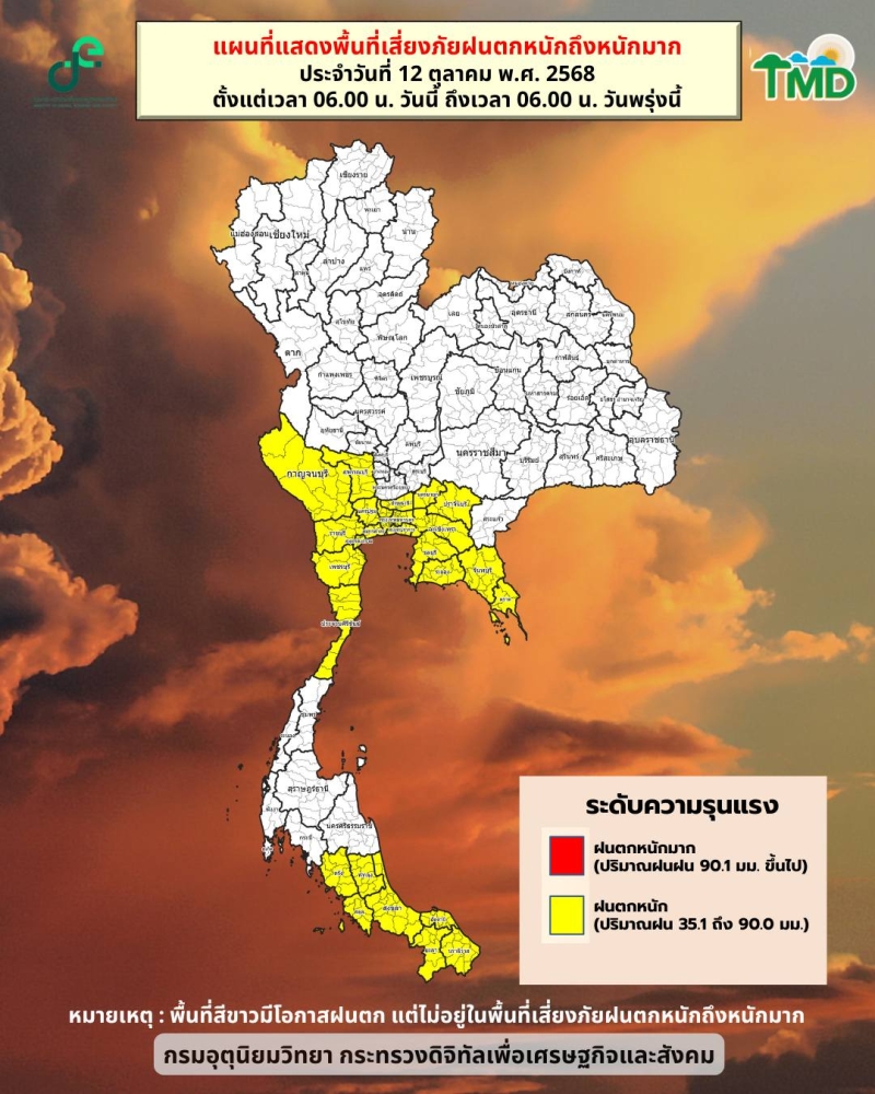 วันที่ 12 ตุลาคม 2568 กรมอุตุนิยมวิทยา พยากรณ์อากาศ 24 ชั่วโมงข้างหน้า ภาคกลางตอนล่าง รวมทั้งกรุงเทพมหานครและปริมณฑล ภาคตะวันออก และภาคใต้มีฝนตกหนักบางพื้นที่ เนื่องจากร่องมรสุมพาดผ่านภาคกลางตอนล่าง ภาคตะวันออก และภาคใต้ตอนบน ประกอบกับมรสุมตะวันตกเฉียงใต้ยังคงพัดปกคลุมทะเลอันดามัน ภาคใต้ตอนล่าง และอ่าวไทย ขอให้ประชาชนในบริเวณดังกล่าวระวังอันตรายจากฝนตกหนักไว้้ด้วย