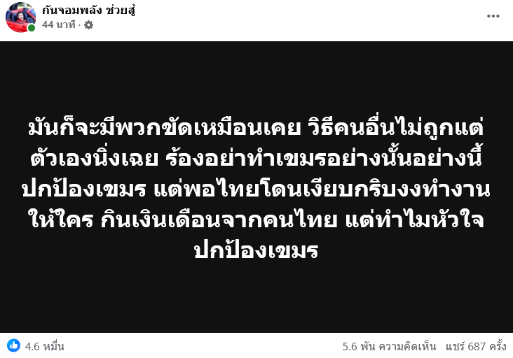 ร้องอย่าทำเขมรอย่างนั้นอย่างนี้ ปกป้องเขมร แต่พอไทยโดน เงียบกริบ งงทำงานให้ใคร กินเงินเดือนจากคนไทย แต่ทำไมหัวใจปกป้องเขมร นอกจากนี้ยังระบุเพิ่มในคอมเมนต์ใต้โพสต์ดังกล่าวว่า มีตำแหน่งฟอร์มแอ็คมาเลย ออกตัวแรงจัด แต่ดันเหยียบกล้วยลื่นล้มโดนรถทัวร์ทับซะแบน