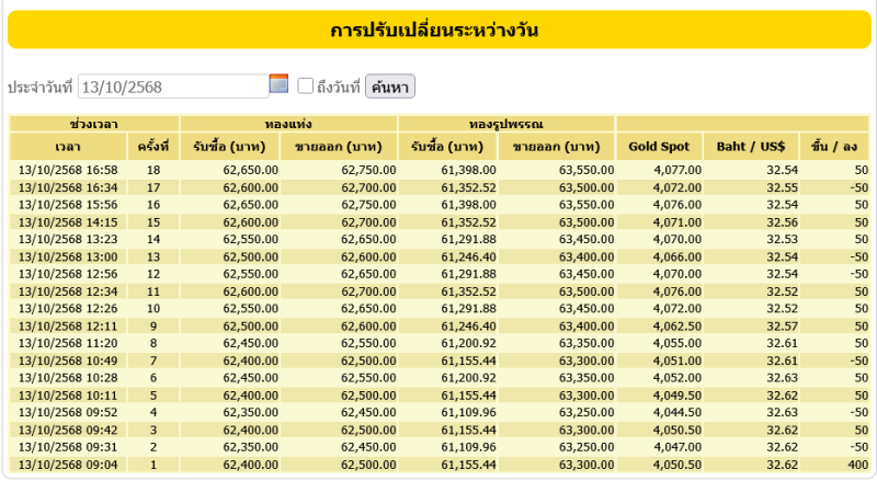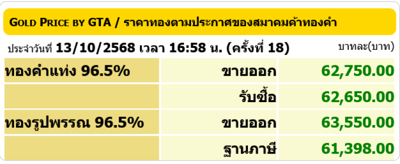 สำหรับราคาทองคำเปิดตลาดประจำวันที่ 13 ตุลาคม 2568 เปิดตลาดปรับขึ้น 400 บาท ในครั้งที่1 ต่อมามีการปรับขึ้น-ลง รวมแล้ว 18 ครั้ง โดยทองรูปพรรณขายออกบาทละ 63,550 ตามข้อมูลจากเว็บไซต์ของ สมาคมค้าทองคำ เมื่อเวลา 16.58 น.