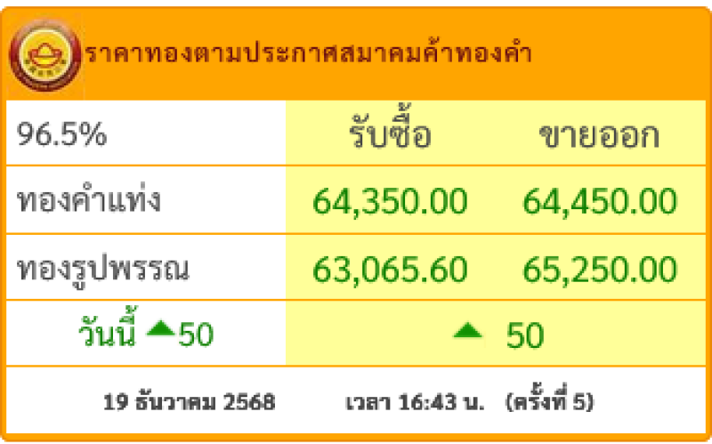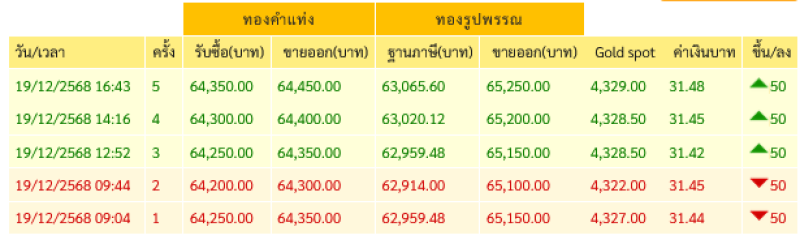 สำหรับราคาทองคำเปิดตลาดประจำวันที่ 19 ธันวาคม 2568 เปิดตลาดปรับลง 50 บาท ในครั้งที่1 ต่อมามีการปรับขึ้น-ลง ปรับครั้งสุดท้ายปิดตลาด รวมแล้ว (ครั้งที่ 5) โดยทองรูปพรรณขายออกบาทละ 65,250 ตามข้อมูลจากเว็บไซต์ของ สมาคมค้าทองคำ เมื่อเวลา 16:43 น.