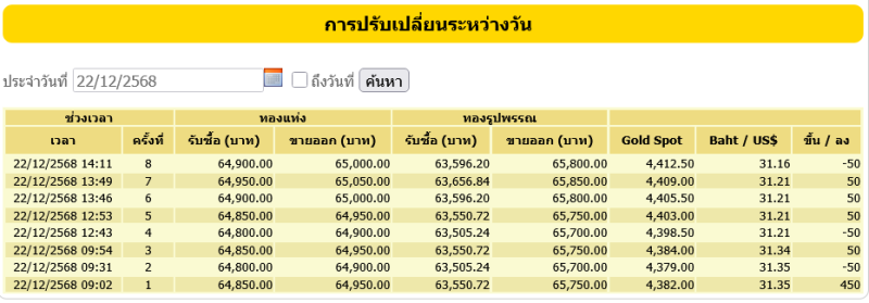 สำหรับราคาทองคำเปิดตลาดประจำวันที่ 22 ธันวาคม 2568 เปิดตลาดปรับขึ้น 450 บาท ในครั้งที่1 ต่อมามีการปรับขึ้นลงรวมแล้ว 8 ครั้ง โดยทองรูปพรรณขายออกบาทละ 65,800 ตามข้อมูลจากเว็บไซต์ของ สมาคมค้าทองคำ เมื่อเวลา 14.11 น.