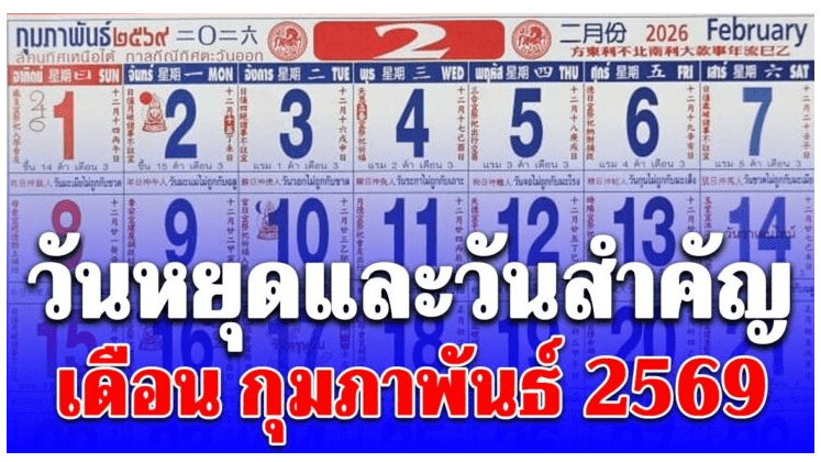 วันหยุดเดือนกุมภาพันธ์ 2569 จะมีวันหยุดราชการ วันหยุดธนาคาร วันหยุดเอกชน วันหยุดกรณีพิเศษ วันไหนบ้างใครมีแผนที่จะเที่ยวพักผ่อนในเดือนนี้ว่าจะไปเที่ยวที่ไหน รีบมาจด รีบมากาปฏิทินเอาไว้เลย