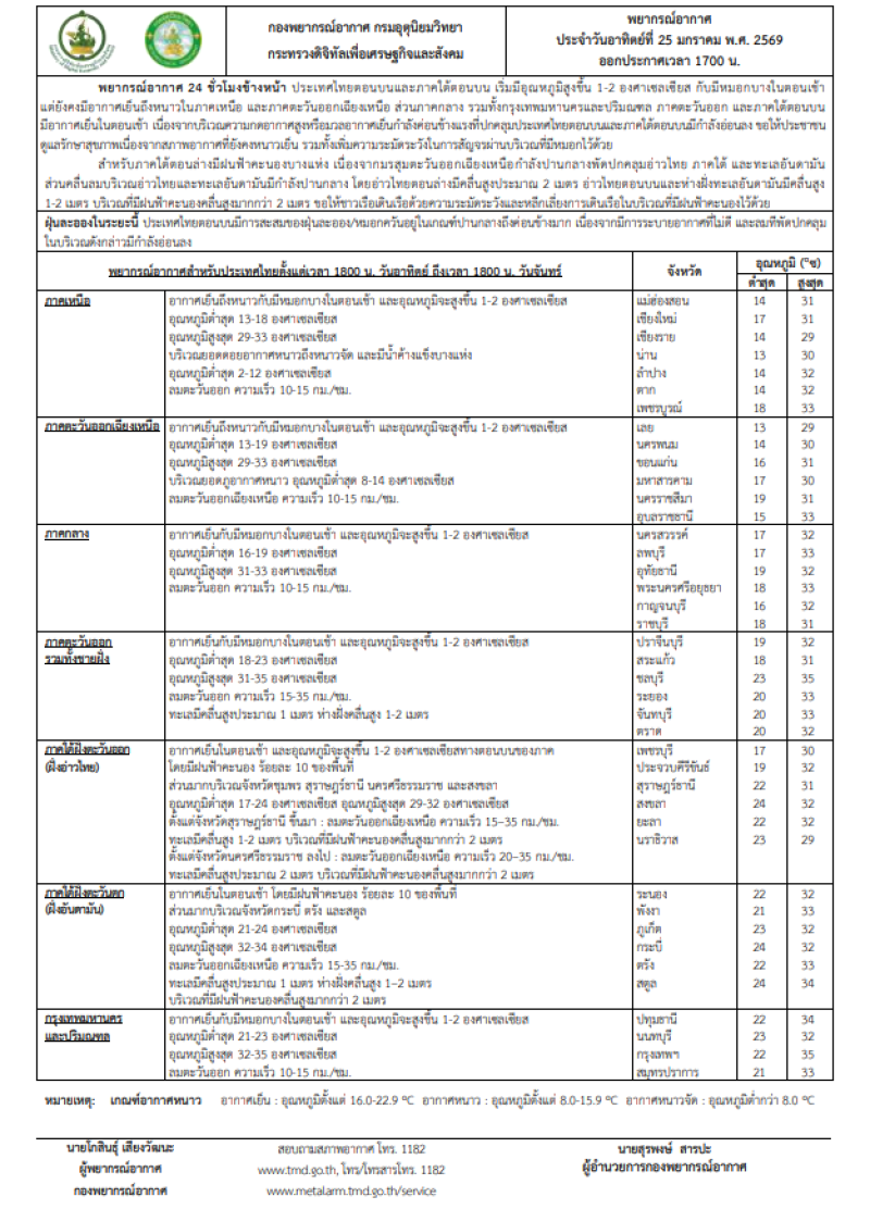วันที่ 25 ม.ค. 2569 กรมอุตุนิยมวิทยาได้พยากรณ์อากาศสำหรับประเทศไทย 18:00 น. วันนี้ ถึง 18:00 น. วันพรุ่งนี้ ดังนี้