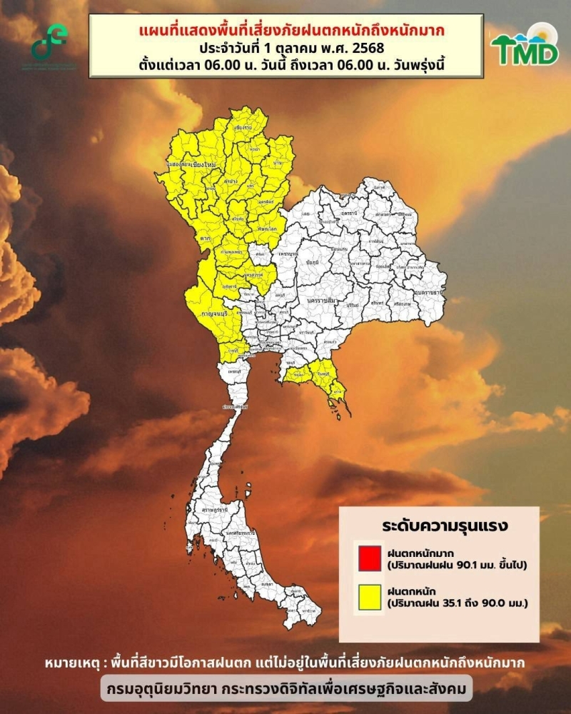 วันที่ 1 ตุลาคม 2568 กรมอุตุนิยมวิทยา พยากรณ์อากาศ 24 ชั่วโมงข้างหน้า ประเทศไทยยังคงมีฝนตกหนักบางแห่ง โดยเฉพาะบริเวณจังหวัดแม่ฮ่องสอน เชียงใหม่ เชียงราย ลำพูน ลำปาง พะเยา น่าน อุตรดิตถ์ สุโขทัย และตาก ขอให้ประชาชนในบริเวณดังกล่าวระวังอันตรายจากฝนตกหนักและฝนที่ตกสะสม ซึ่งอาจทำให้เกิดน้ำท่วมฉับพลัน น้ำป่าไหลหลาก และน้ำล้นตลิ่ง โดยเฉพาะพื้นที่ลาดเชิงเขาใกล้ทางน้ำไหลผ่าน พื้นที่ลุ่ม และพื้นที่น้ำท่วมขัง เนื่องจากมีลมตะวันออกและลมตะวันออกเฉียงใต้พัดปกคลุมภาคตะวันออกเฉียงเหนือ ในขณะที่มรสุมตะวันตกเฉียงใต้ที่พัดปกคลุมทะเลอันดามัน ประเทศไทย และอ่าวไทยมีกำลังอ่อนลง
