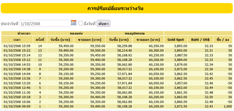 สำหรับราคาทองคำเปิดตลาดประจำวันที่ 1 ตุลาคม 2568 เปิดตลาดปรับขึ้น 1,000 บาท ในครั้งที่1 ต่อมามีการปรับขึ้น-ลง รวมแล้ว 14 ครั้ง โดยทองรูปพรรณขายออกบาทละ 60,350 ตามข้อมูลจากเว็บไซต์ของ สมาคมค้าทองคำ เมื่อเวลา 15.59 น.
