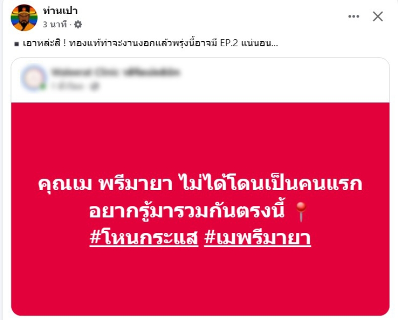 ล่าสุด ทางเพจ ท่านเปา ได้ออกมาเผยอีกว่า มีคลินิกดัง ได้ออกมาแฉเพิ่ม โดยใช้แคปชั่นว่า เอาหล่ะสิ ! ทองแท้ท่าจะงานงอก พรุ่งนี้อาจมี EP.2 แน่นอน..บานปลายยย และทางคลินิกเผยว่า คุณเม พรีมายา ไม่ได้โดนเป็นคนแรก อยากรู้มารวมกันตรงนี้ #โหนกระแส #เมพรีมายา
