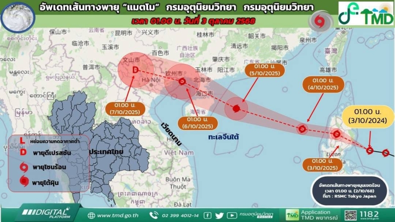 วันที่ 3 ต.ค. 68 กรมอุตุนิยมวิทยา อัพเดทเส้นทางพายุโซนร้อน แมตโม (MATMO) เช้าวันนี้ (3 ต.ค. 68) ศูนย์กลางอยู่ทางตะวันออกของ ฟิลิปปินส์ เคลื่อนตัว ตะวันตกเฉียงเหนือ คาดว่าจะผ่านเกาะลูซอนและลงสู่ ทะเลจีนใต้ตอนบน วันนี้ จากนั้นจะมุ่งไปทาง เกาะไหหลำ และขึ้นฝั่ง จีนตอนใต้ ในช่วง 5-6 ต.ค. 68