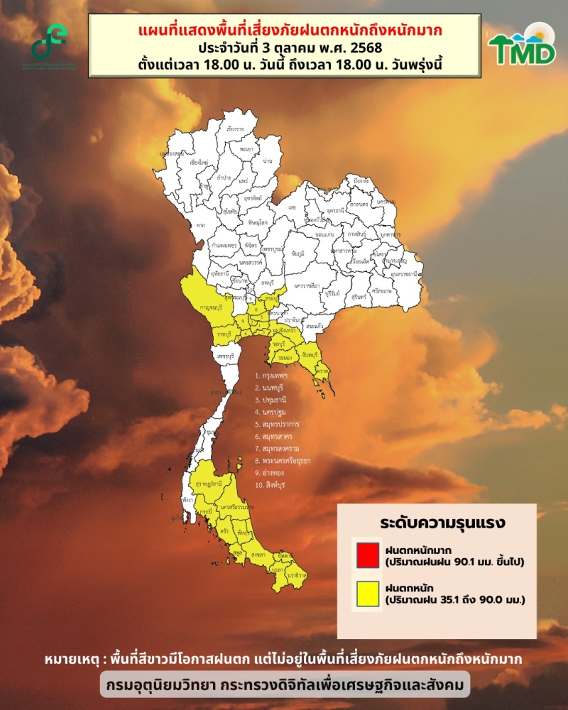 วันที่ 3 ตุลาคม 2568 กรมอุตุนิยมวิทยา พยากรณ์อากาศ 24 ชั่วโมงข้างหน้า ภาคกลาง รวมทั้งกรุงเทพมหานครและปริมณฑล ภาคตะวันออก และภาคใต้มีฝนตกหนักบางแห่ง ขอให้ประชาชนในบริเวณดังกล่าวระวังอันตรายจากฝนตกหนักไว้ด้วย เนื่องจากมีลมตะวันออกและลมตะวันออกเฉียงใต้พัดปกคลุมภาคตะวันออกเฉียงเหนือ ภาคตะวันออก ภาคกลางด้านตะวันออก และอ่าวไทย ประกอบกับมรสุมตะวันตกเฉียงใต้กำลังอ่อนยังคงพัดปกคลุมทะเลอันดามัน และด้านตะวันตกของประเทศไทย