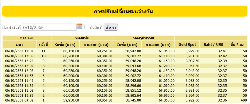 สำหรับราคาทองคำเปิดตลาดประจำวันที่ 6 ตุลาคม 2568 เปิดตลาดปรับขึ้น 600 บาท ในครั้งที่1 ต่อมามีการปรับขึ้น-ลง รวมแล้ว 11 ครั้ง โดยทองรูปพรรณขายออกบาทละ 61,050 ตามข้อมูลจากเว็บไซต์ของ สมาคมค้าทองคำ เมื่อเวลา 13.07 น.