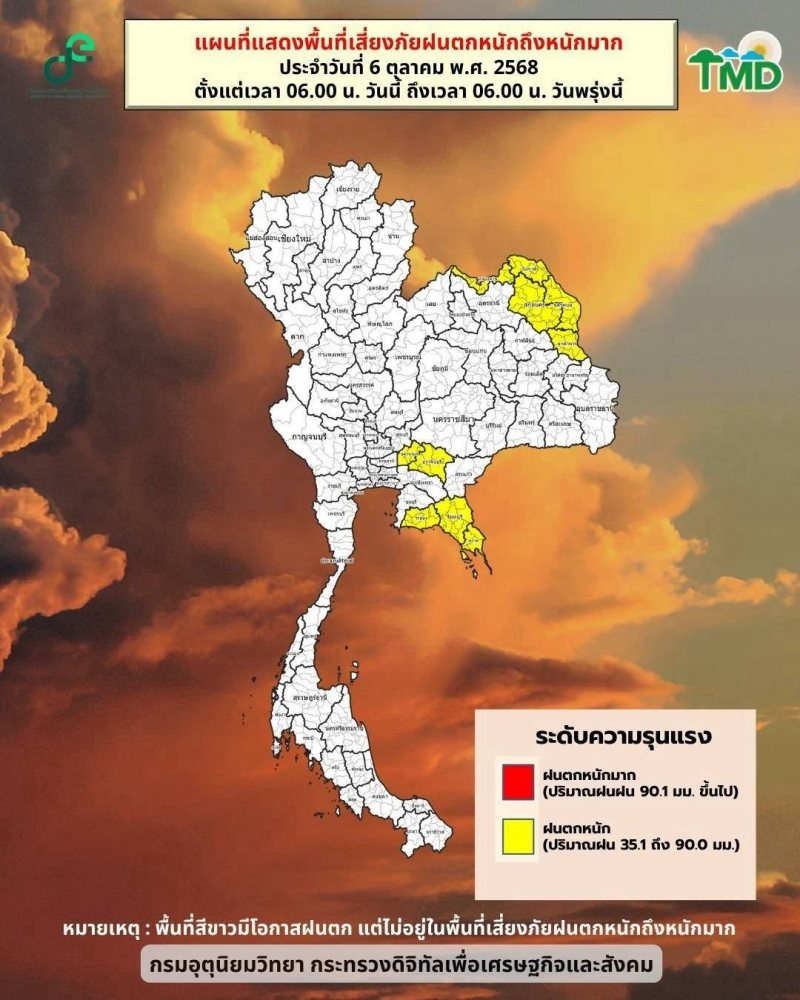 วันที่ 6 ตุลาคม 2568 กรมอุตุนิยมวิมยา พยากรณ์อากาศ 24 ชั่วโมงข้างหน้า บริเวณภาคตะวันออกเฉียงเหนือ และภาคตะวันออกมีฝนตกหนักบางแห่ง โดยเฉพาะบริเวณจังหวัดหนองคาย บึงกาฬ สกลนคร นครพนม จันทบุรี และตราด ขอให้ประชาชนในบริเวณดังกล่าวระวังอันตรายจากฝนตกหนักไว้ด้วย เนื่องจากมรสุมตะวันตกเฉียงใต้กำลังปานกลางที่พัดปกคลุมทะเลอันดามัน ประเทศไทย และอ่าวไทยจะมีกำลังแรงขึ้น