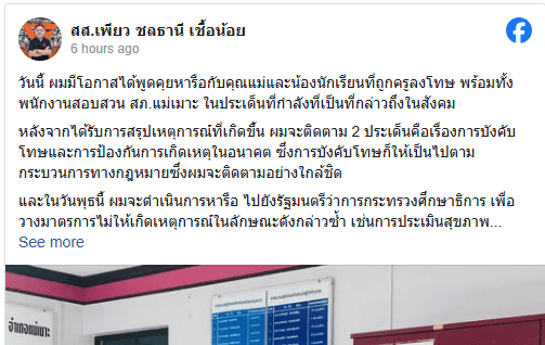เมื่อเวลา 09.00 น. วันที่ 6 ตุลาคม แม่ของเด็กนักเรียนชายอายุ 7 ขวบ ชั้น ป.1 โรงเรียนบ้านแม่จาง ตำบลนาสัก อำเภอแม่เมาะ จังหวัดลำปาง ได้นำลูกชายเดินทางเข้าพบพนักงานสอบสวน สภ.แม่เมาะ เพื่อให้ปากคำเพิ่มเติม โดยมีอัยการ เจ้าหน้าที่บ้านพักเด็ก และสหวิชาชีพ ร่วมสอบร่วมสังเกตการณ์อย่างใกล้ชิด หลังเกิดเหตุถูกครูชายทำร้ายร่างกาย