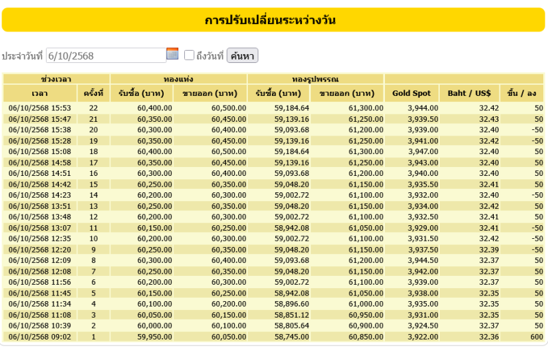 สำหรับราคาทองคำเปิดตลาดประจำวันที่ 6 ตุลาคม 2568 เปิดตลาดปรับขึ้น 600 บาท ในครั้งที่1 ต่อมามีการปรับขึ้น-ลง รวมแล้ว 22 ครั้ง