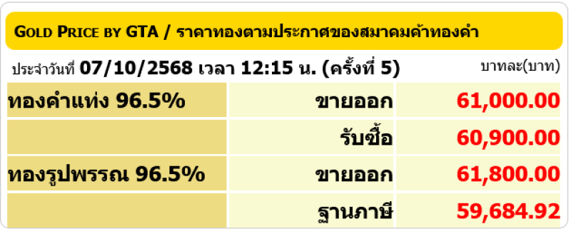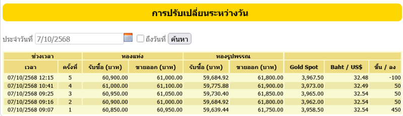 สำหรับราคาทองคำเปิดตลาดประจำวันที่ 7 ตุลาคม 2568 เปิดตลาดปรับขึ้น 450 บาท ในครั้งที่1 ต่อมามีการปรับขึ้น-ลง รวมแล้ว 5 ครั้ง