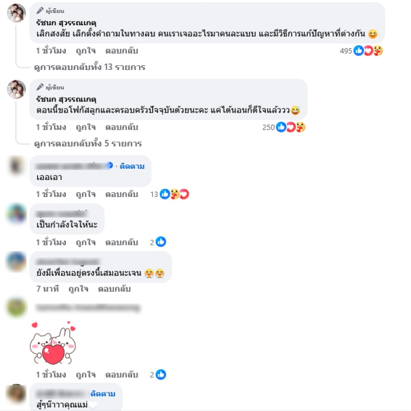 เลิกสงสัย เลิกตั้งคำถามในทางลบ คนเราเจออะไรมาคนละแบบ และมีวิธีการแก้ปัญหาที่ต่างกัน ตอนนี้ขอโฟกัสลูกและครอบครัวปัจจุบันด้วยนะคะ แค่ได้นอนก็ดีใจแล้ว ท่ามกลางแฟนๆต่างเข้ามาคอมเมนต์ส่งกำลังใจให้กับทั้งคู่กันอย่างมาก