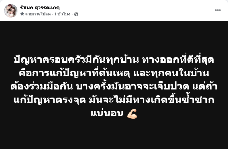 ล่าสุดทางด้าน เจนนี่ ได้ออกมาโพสต์ข้อความว่า ปัญหาครอบครัวมีกันทุกบ้าน ทางออกที่ดีที่สุด คือการแก้ปัญหาที่ต้นเหตุ และทุกคนในบ้านต้องร่วมมือกัน บางครั้งมันอาจจะเจ็บปวด แต่ถ้าแก้ปัญหาตรงจุด มันจะไม่มีทางเกิดขึ้นซ้ำซากแน่นอน