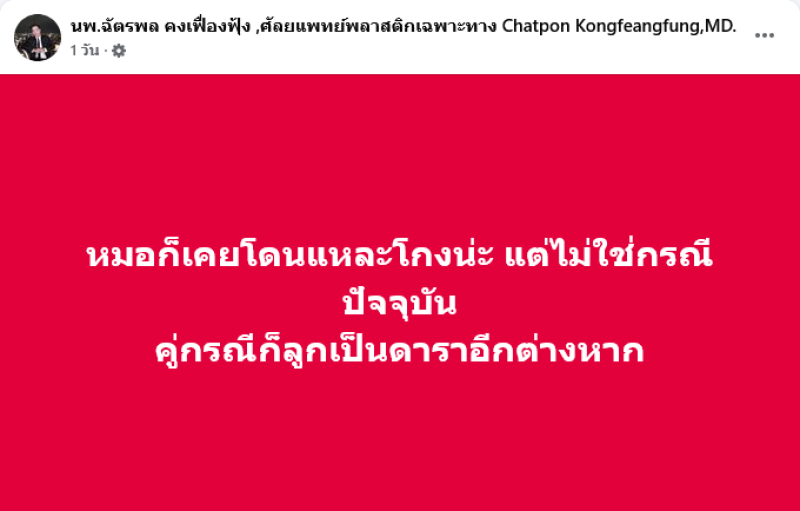 หมอก็เคยโดนแหละโกงน่ะ แต่ไม่ใช่กรณีปัจจุบัน คู่กรณีก็ลูกเป็นดาราอีกต่างหาก ท่ามกลางชาวเน็ตต่างเข้ามาคอมเมนต์อยากใส่ใจกันอย่างมาก
