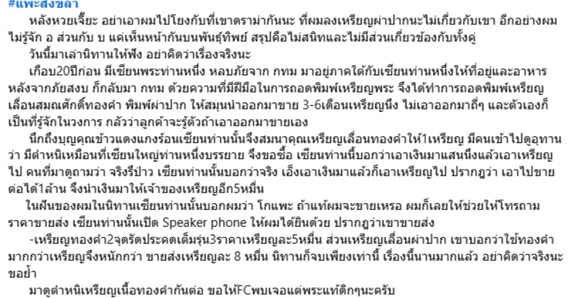 ศึกดรามาในวงการพระเครื่องยังคงคุกรุ่น ล่าสุด แพะ สงขลา เซียนพระชื่อดัง ได้ออกมาเคลื่อนไหวผ่านเฟซบุ๊กส่วนตัว โพสต์ข้อความยืนยันชัดว่า ตนไม่เกี่ยวข้องกับประเด็นร้อนที่กำลังถูกพูดถึง พร้อมเล่านิทานสอดแทรกข้อคิดให้คนเล่นพระใช้วิจารณญาณ