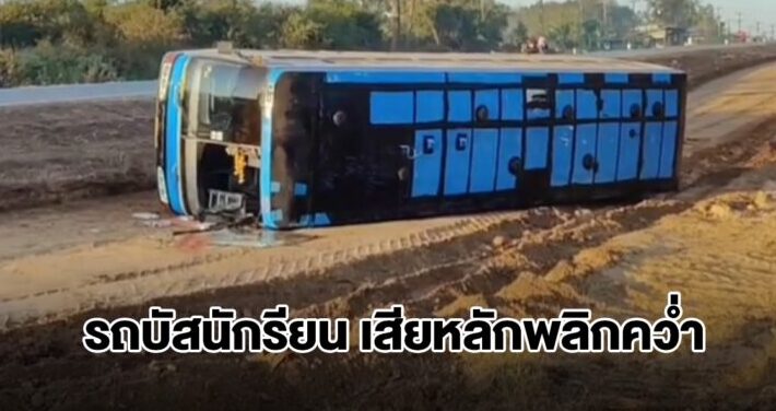 รถบัสรับ-ส่งนักรียน เสียหลักพลิกคว่ำลงข้างทาง