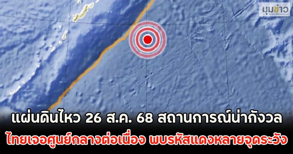 กองเฝ้าระวังแผ่นดินไหวประเทศไทย ได้ออกมาเปิดข้อมูลที่เก็บบันทึกการเกิดเหตุแผ่นดินไหวให้ทราบกันของ วันที่ 26 สิงหาคม 2568 ว่าศูนย์กลางแผ่นดินไหวยังคงใกล้ประเทศไทยอย่างต่อเนื่อง น่าเป็นห่วง โดยเฉพาะประเทศเมียนมา และวันที่ 25 ส.ค. พบศูนย์กลางเกิดขึ้นที่ประเทศไทย 2 ครั้งจังหวัดทางภาคเหนือ ขณะที่เมื่อไปดูสถานการณ์แผ่นดิน 26 สิงหาคม 2568 ตั้งแต่เวลา