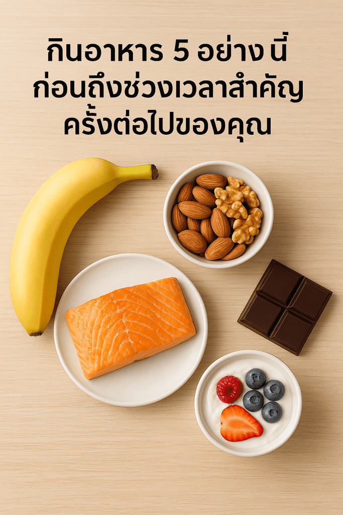 ก่อนถึง “ช่วงเวลาสำคัญ” ที่คุณพูดถึง—ไม่ว่าจะเป็นสอบ สัมภาษณ์ หรือแม้แต่งานเดต—สิ่งที่คุณใส่เข้าไปในท้องคือเชื้อเพลิงของสมองและพลังงานครับ 🥑✨ 5 อย่างที่ช่วยได้ ทำไมสิ่งเหล่านี้ถึงช่วย อยากให้ผมเลือก เมนูชุดสั้น ๆ (เช่น อาหารเช้าหรือว่างก่อนออกไป) จาก 5 อย่างนี้ให้เหมาะกับช่วงสำคัญของคุณไหมครับ?